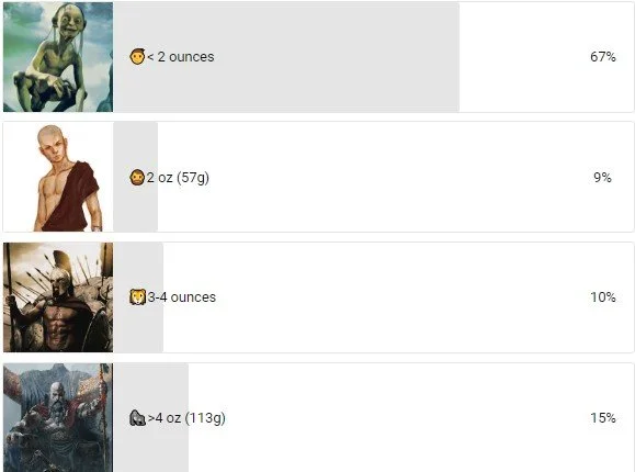 According to the poll, 67% of respondents reported eating less than 2 ounces of salmon per day. Since fatty fish is one of the few healthy and dense sources of Omega-3 fatty acids, one of the most important forms of fat for overall male health, this amount falls below the optimal amount needed to maximize testosterone and muscle hypertrophy, as well as strength, cognition, insulin sensitivity, blood cholesterol, lowering inflammation and oxidative stress, and much more (S, S, S, S, S).